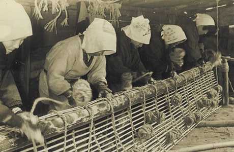 写真は、昭和初期に近くの主婦の女性が魞を組み立てている様子です。