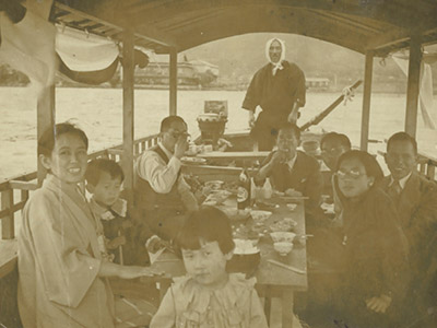屋形船で天ぷらを食べながら、大人はビール(キリンビール?)を、子供はジュースを飲んで楽しんでいました。天ぷらには、魞で獲れたコイやフナが使われていました。