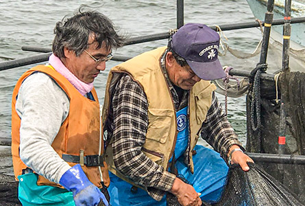 魞漁は、網やロープのメンテナンスが絶えず必要です。特に台風後の修理が大変で複数人で行うこともあります。