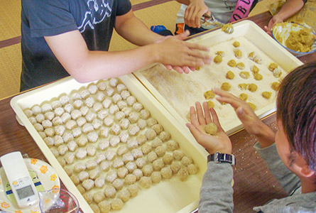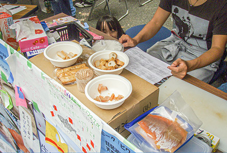 右の写真は、市場に出回らない雑魚をフードプロセッサーにかけて、練物にしてパン粉をつけています。油で揚げるととても美味しく食べることができます。学園祭では大人気でした。このように見た目や形が変わると不思議と消費が進みます。日々、試行錯誤の繰り返しで商品が出来上がってきます。